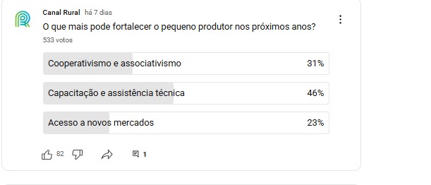 Na interatividade da semana, perguntamos: O que mais pode fortalecer o pequeno produtor nos próximos anos? O resultado revelou um retrato claro do pequeno produtor brasileiro. Com 46% dos votos, a capacitação e assistência técnica aparecem como o principal caminho para o fortalecimento do campo, sinal de que o produtor quer aprender, inovar e gerir melhor sua atividade.
